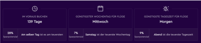Ebenso ausschlaggebend für den Flugpreis ist die Tageszeit des Abflugs. Wenn man zwischen 12 und 14 Uhr von Deutschland aus zu Zielen in Europa reist, muss man im Durchschnitt 7 Prozent weniger bezahlen als bei der Abreise am Nachmittag (14 bis 18 Uhr). Für Langstreckenflüge gilt jedoch das Gegenteil: Flüge am Morgen sind hier mit durchschnittlich 537 Euro am günstigsten, während man am Nachmittag durchschnittlich 589 Euro für das Ticket einplanen muss.
