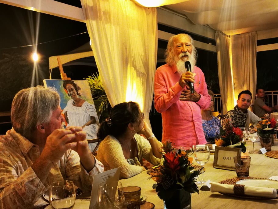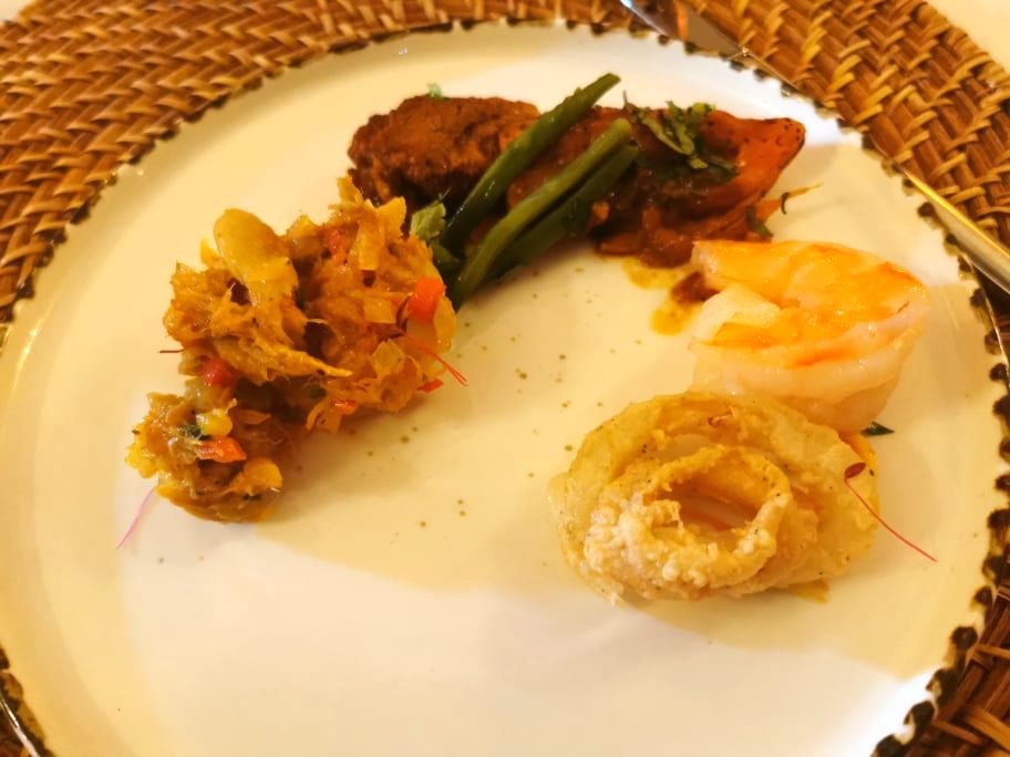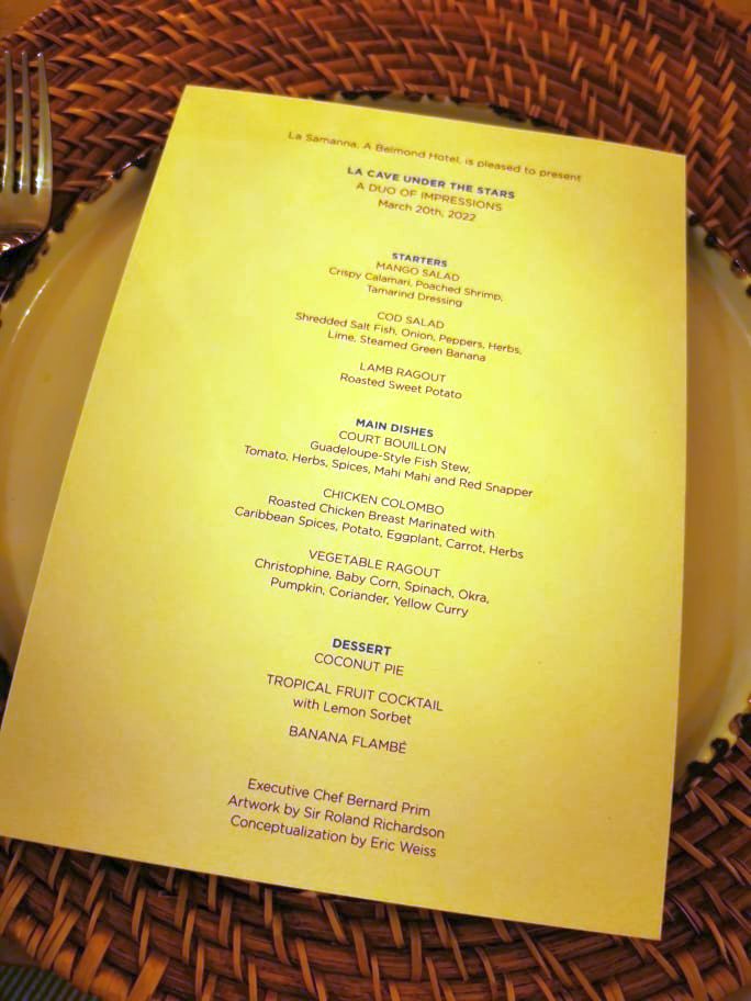 Sechs farbenprächtige Gemälde des Künstlers umrandeten das kulinarische Event dabei. Farbenfroh sah es auch auf den Tellern der Gäste aus, denn die Vielfalt des Menüs bestand aus kreolischen Gerichten von Executive Chef Bernard Prim. Ein Zusammenspiel von traditionellen Komponenten gepaart mit interessanten Gewürzeinschlägen. Beginnend beim Mango Salat mit Calamari, Shrimps und Tamarind Dressing ging es weiter mit einem Lammragout und gerösteten süssen Tomaten sowie einem weiteren fruchtigen Salat mit Salzfisch und starken Kräutern.
