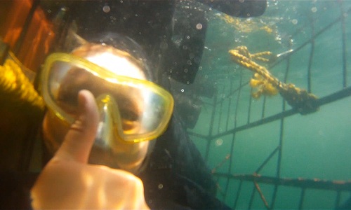 In einem Käfig der im Wasser am Boot befestigt ist, werden dann bis zu 5 mutige “Hai-Touristen” ins Wasser gelassen. Gerüstet mit einem Neoprenanzug gegen die Kälte und natürlich einem Unterwasser-Fotoapparat oder Videocam. Dann wartet man auf DIE Begegnung…