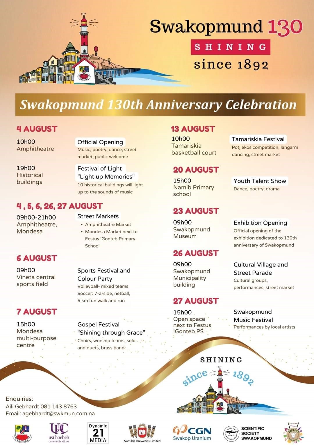Zur Feier des 130-jährigen Bestehens veranstaltet Swakopmund einen Festival-Monat unter dem Motto „Shining since 1892“. Die Feierlichkeiten begannen offiziell im Amphitheater am 04.08. mit Musik- und Tanzdarbietungen, einem Straßenmarkt in der Stadt sowie einer Lichtshow, bei der zehn historische Gebäude der Stadt speziell illuminiert wurden. Auf dem Programm stehen im weiteren Verlauf u. a. eine Gospel-Veranstaltung, weitere Straßenmärkte, eine Jugend-Talent-Show sowie zum krönenden Abschluss am 27.08. ein eigens für die Feierlichkeiten aufgelegtes Musikfestival. Das genaue Programm kann dem beiliegenden Flyer entnommen werden. Dieses einmalige und kulturell vielfältige Ereignis sorgt für unvergessliche Highlights während einer Namibia-Reise.