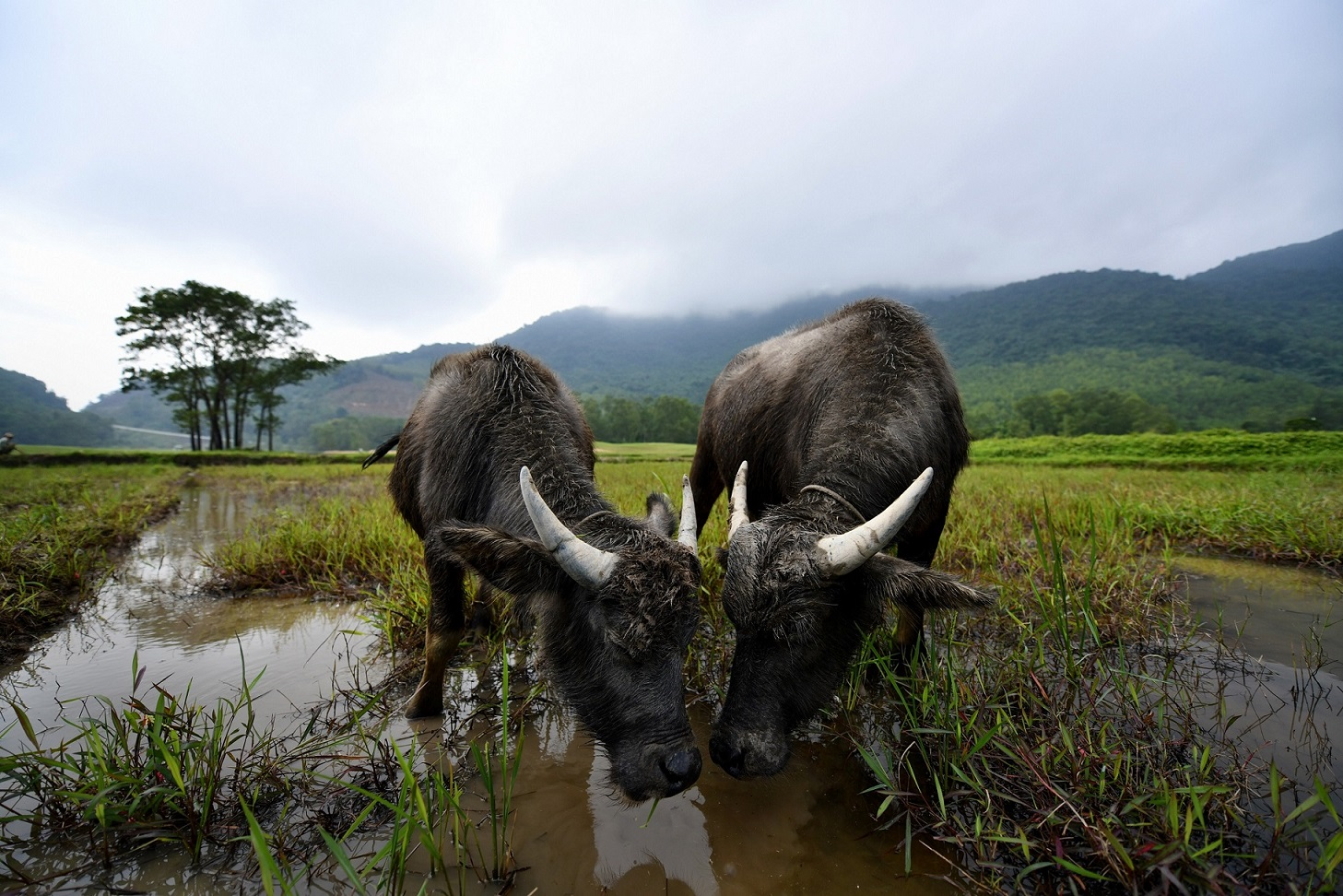 Seit kurzem ziehen Tu Phat (Vater), Chi Chi (Mutter) und Bao (Kind) durch die weitläufige Lagunenlandschaft rund um den Laguna Lăng Cô Golfplatz in Zentralvietnam. Die kleine Wasserbüffelfamilie fühlt sich in ihrem neuen Zuhause wohl: Vier Hektar große Reisfelder und weitläufige Wasserstraßen umgeben den 18-Loch-Meisterschaftskurs und machen ihn damit zu einem echten Büffelparadies. Die Tiere übernehmen nicht nur die Feldpflege, sondern sorgen auch für eine authentisch vietnamesische Atmosphäre.
