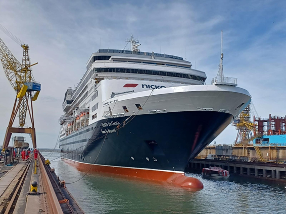 Dank hochqualifizierter Arbeitskräfte und vieler helfender Hände erstrahlt das Hochseeschiff von nicko cruises beim Ablegen am 11. Mai 2024 in neuem Glanz. Und das im wahrsten Sinne des Wortes. Reisende auf der VASCO DA GAMA dürfen sich somit auf ein schickes und generalüberholtes Schiff freuen.