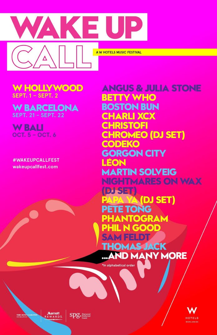WAKE UP CALL wird mit einer Mischung aus angesagten Musikern und jungen Talenten aufwarten. Darunter befinden sich unter anderem Künstler wie Phantogram, Charli XCX, Chromeo (DJ Set), Betty Who, Léon and Dancing Pineapple Presents: Codeko, Papa Ya (DJ Set), Christofi und Phil N Good im W Hollywood; Martin Solveig, Gorgon City, Thomas Jack, Boston Bun und Special Guest Pete Tong im W Barcelona sowie Angus & Julia Stone, Sam Feldt und Nightmares on Wax (DJ Set) im W Bali. Weitere Künstler werden in Kürze bekannt gegeben. Das Angebot der Festivals geht jedoch weit über die Musik hinaus: In jedem Winkel ist das typische W Erlebnis geboten, von Workouts mit hochrangigen Fitness-Trainern bis hin zu Speisen und Cocktails, welche die W Chefs und Barkeeper eigens für Festivalbesucher kreieren. WAKE UP CALL vereint Pre-Party, die Hauptverantstaltung und After-Show-Party in einem Paket. Darüber hinaus haben Marriott Rewards- und SPG-Mitglieder die Möglichkeit, ein Punkteangebot für noch exklusivere WAKE UP CALL-Momente abzugeben, darunter ein 60-minütiger DJ-Workshop, After-Show-Parties mit den Stars in einer Suite sowie Abenteuer abseits des Festivals, die von Festival Talent betreut werden. Buchungen können unter www.wakeupcallfest.com durchgeführt werden.