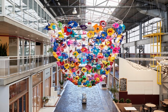 • Ein riesiger, farbenprächtiger Blumen-Kronleuchter, der aus 2.800 recycelten Plastikflaschen entstanden ist