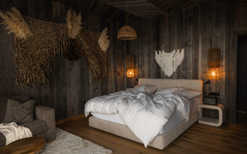 Mit acht neuen, liebevoll gestalteten Wohneinheiten erweiterte das Boho-Hotel Jufenalm sein Angebot auf insgesamt 38 Zimmer und Suiten. Die drei neuen Kategorien verbinden auf individuelle Weise Design, Natur, Panorama und private Spa-Momente geschickt, die alle das besondere Boho-Design und die Leichtigkeit innehaben. Die Sky Suite Himmelnah bietet auf rund 45 Quadratmetern einen luftigen Rückzugsort mit viel Licht und einem großen Balkon mit freiem Blick auf die Berge für bis zu fünf Personen. Auf Wunsch kann die Suite als Penthouse-Variante gebucht werden – mit noch mehr Weite und Aussicht durch den offenen Giebel. Für diejenigen, die einen direkten Zugang zur Spa-Area und zum Naturpool wünschen, ist die Pool Suite Morgentau mit Terrasse oder Wintergarten und Blick ins Tal eine gute Wahl. Eingebettet in die Natur und in unmittelbarer Nähe zum Spa erwartet sie die Gartensuite Gartengeflüster – ein Refugium für zwei bis vier Personen, die Ruhe, Stil und Natur verbinden möchten. Großzügige Räume mit fließendem Übergang nach draußen, ein eigener Garten direkt vor der Terrasse und der Blick ins Grüne laden zum Durchatmen ein. Sanfte Farben, natürliche Materialien und liebevolle Details schaffen eine Atmosphäre, die Geborgenheit vermittelt.