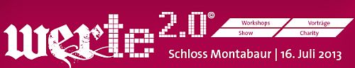 Das Event „Werte 2.0“ der Veranstalter Intergerma, Estrel Berlin und Hotel Schloss Montabaur geht am 16. Juli 2013 in Montabaur in die vierte Runde. In Vorträgen und Workshops beleuchten renommierte Referenten, welche traditionellen Werte nach wie vor Bestand haben, welche modernen Werte künftig Anwendung finden und wie diese Werte die unternehmerische Zukunft beeinflussen. Neben provokanten Thesen und Prognosen erwartet die Teilnehmer Gelegenheit zum Networking sowie ein Gastauftritt von „Robbie Williams“-Double Mario Nowack aus „Stars in Concert“ und eine Spendenaktion unter prominenter Schirmherrschaft von Fernseh-Moderator Wolfram Kons.
