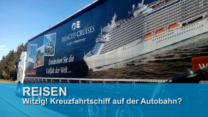 Ein seltenes Bild: Ein Kreuzfahrtschiff auf der Autobahn…Kreuzfahrten werden immer beliebter, daher werden auch die Werbeflächen für solche Schiffe immer innovativer. Dieses Schiff fährt per LKW täglich über Europas Strassen…Ein wahrer Hingucker!